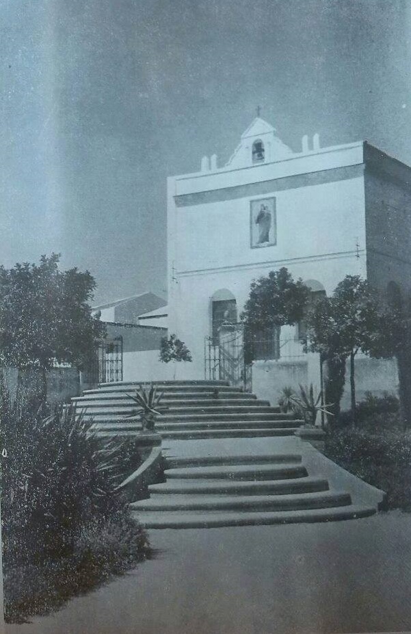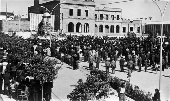 De hecho, la misma Parroquia, estaba inicialmente en la ubicación actual del Centro, como podemos comprobar en la imagen adjunta; como también podemos comprobar que en el año 1968, en pleno primer curso escolar, la puerta de acceso todavía estaba en su ubicación antigua, que hoy corresponde con la Sala de Profesores. En cambio en la foto de la Feria de Muestras del año 1970, podemos comprobar que la fachada ya es como en la actualidad.